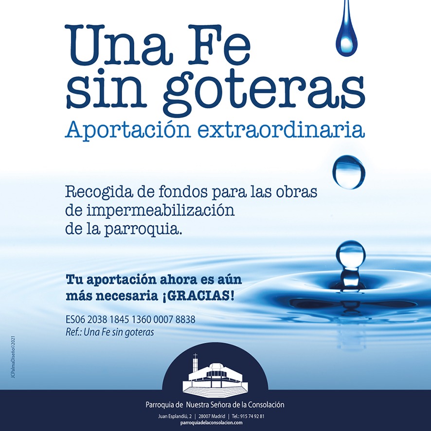 “UNA FE SIN GOTERAS” es el nombre elegido para esta campaña de recaudación de fondos. Invitamos a todos a promover entre vuestros relacionados su apoyo a esta campaña de solidaridad con la parroquia. Toda aportación será bienvenida.