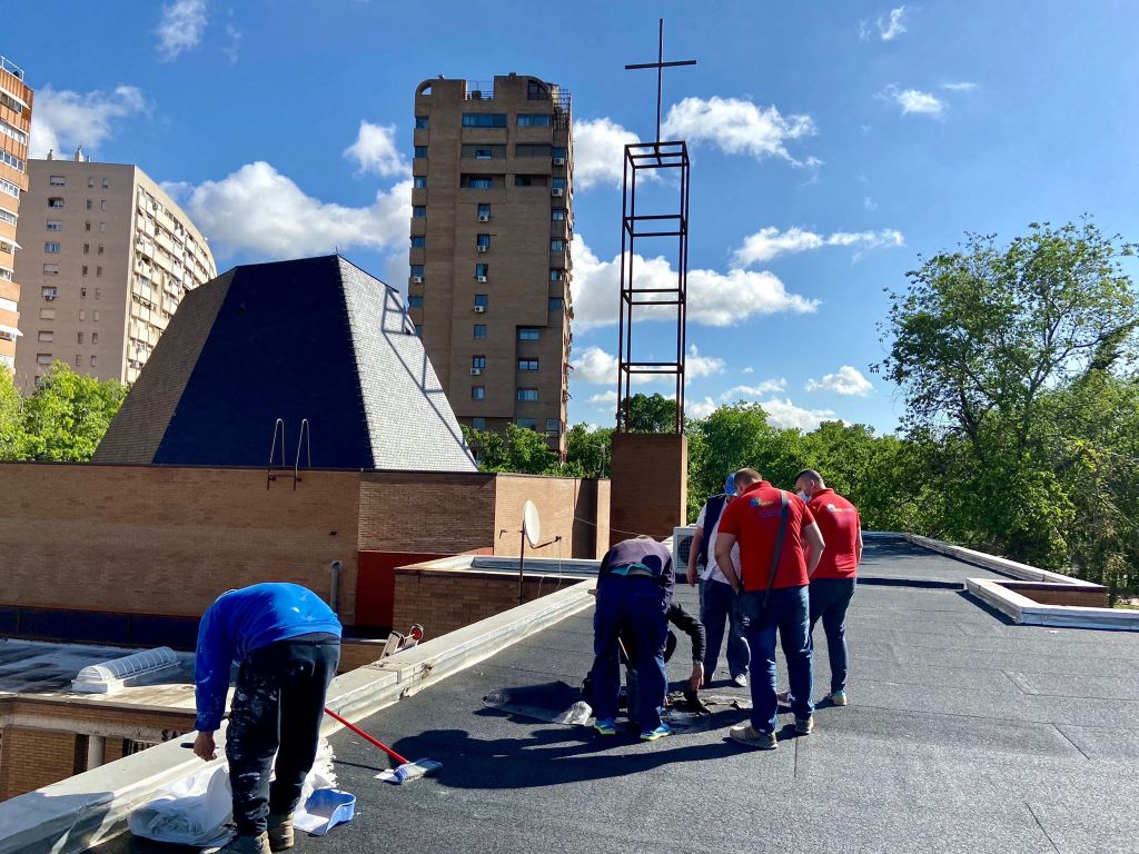 En la mañana de este lunes, un grupo de cinco trabajadores de la empresa Soluciones integrales RHM Madrid, S.L. inicio los trabajos de reparación e impermeabilización de los techos de nuestro edificio parroquial.