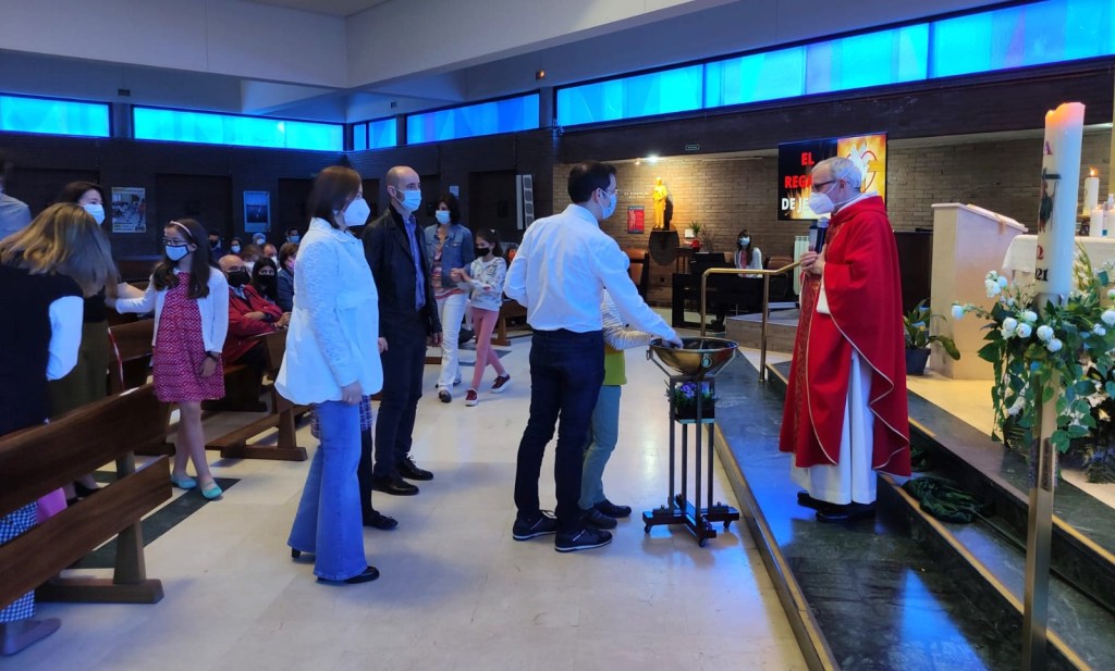También se invitó a toda la comunidad a renovar con los niños su compromiso bautismal. Y, como señal de que todos hicimos esa renovación de nuestras promesas bautismales, primero los pequeños y después el resto de la comunidad, nos acercamos a la pila bautismal e hicimos la señal de la cruz después de mojar nuestros dedos en el agua bendita dela fuente.